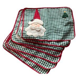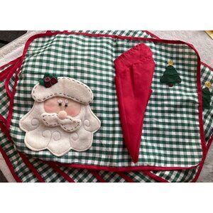 Add festive charm to your dining table with this set of 7 Christmas-themed placemats and Napkins. The green checkered pattern complements the adorable Santa 3D appliqué.**Very good condition just ligth spot behind one of them see photo number 4, 5 napinks are Dark red and 2 of them are Bright Red see photo number 8 ** Measurments=`19"x13"