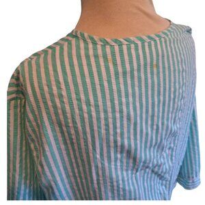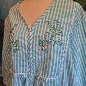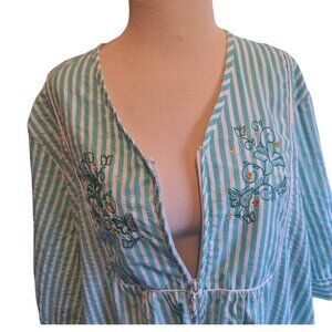 Collections Etc Womens House Dress Moo Moo XL Green White Stripe Embroidery Zip
