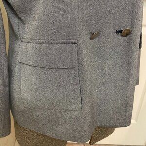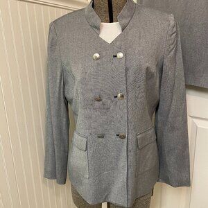 Collections for Le Suit suit with double breasted jacket and skirt, size 12. Jacket and skirt are both 100% rayon and fully lined in navy colored 100% polyester lining. Jacket is made to be worn without a blouse, and two front pockets with flap closures. Jacket has six silver buttons that have some silver tarnish. Skirt has invisible zipper with hook and eye closure, and a 9 inch back slit for ease in wearing. Great suit for the court room or office. Condition 8/10.
