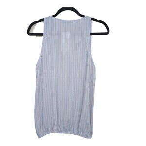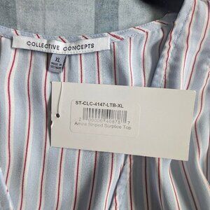 Add a pop of color and effortless style to your wardrobe with this chic sleeveless blouse from Collective Concepts. Featuring a flattering V-neckline and a vibrant vertical stripe pattern in shades of blue, white, and red, this top is perfect for both casual outings and office-ready looks.