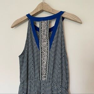 Features: blue geometric pattern, maxi dress, high neckline, sleeveless