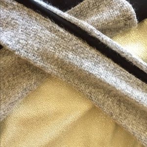 Such a perfect combination of cozy and fun. Arms and back are the softest yarn imaginable the contrasting black stripes are a also a soft cotton (the same material is used for the banded waist). The highlight is the front panel which is shimmering while remaining subtle. Wear with jeans or dress it up with black pants or a cute skirt and boots! It is night out perfection!!