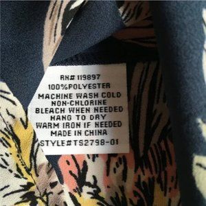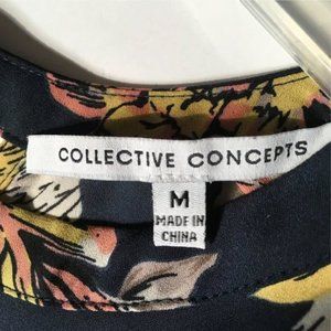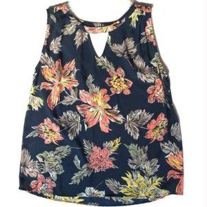 Collective Concepts Lauralai keyhole detail blouse, size M. Pretty navy blue floral sleeveless top with peach and gold flowers with green and tan leaves. 100% Polyester. Very good pre-owned condition. Please see photos for details.