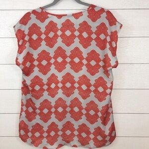 Orange print on gray background. Fabric is semi sheer, 100% polyester. V neck, gently gathered at shoulders. Item is previously owned, no stains. Please note pull in fabric as is shown in last photo.