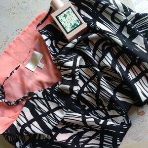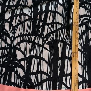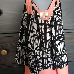 Shorter, top layer is abstract black and white, and longer bottom one, salmony pink.