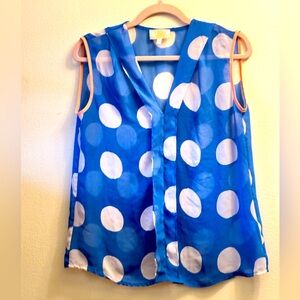 Worn only once Collective Concepts blue and white polka dot button up blouse, size small, sheer