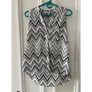 collective concepts, size medium white and black patterned tank,  button-down for a portion, v-neck,  pit to pit 18.5 inches,  shoulder to bottom 24.5 inches, 100% polyester