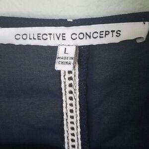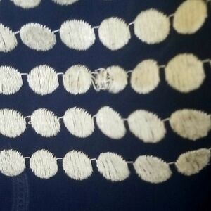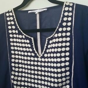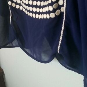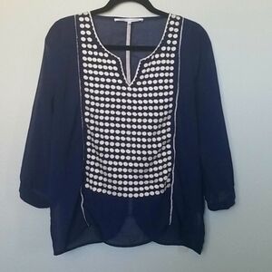Sheer navy blue blouse. Has embroidered like white circle dots in front. The hem has a gathered look. The back has a threaded detail down the center that has a cut out design. 3/4 sleeve. One of the circles looks to come unraveled, see close up, its towards the bottom. Stitch fix brand. Smoke free home, great condition.