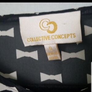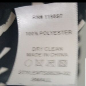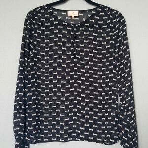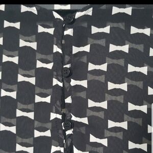 So cute! Sheer black with cream bow design. Sleeves can be rolled up and tabbed or worn down. Has 3 button detail at chest. There are 2 runs in the back, see pic. Smoke free home. Excellent for the office. No stretch, lightweight fabric.