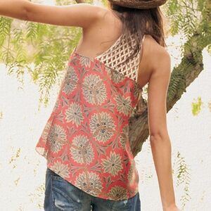 Geometric crotchet crafts the racerback of an airy tank shaped by pleats at the U-neck for added dimension