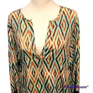 Made with a satiny polyester front and sheer black rayon back Multi color pattern has a retro 70s feel
