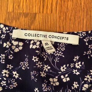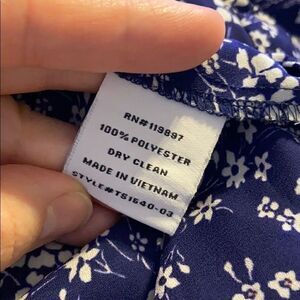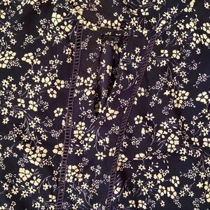 Navy blue chiffon flowy boho blouse with cream floral pattern. Crochet detailing down front and on back. Keyhole in front. Sleeves are 3/4 length with elastic hem.