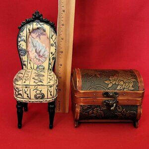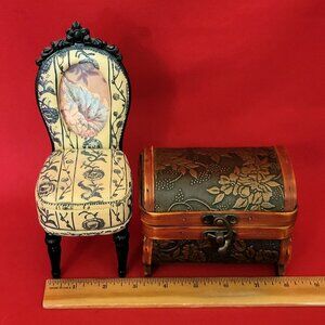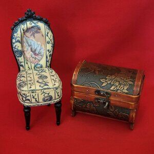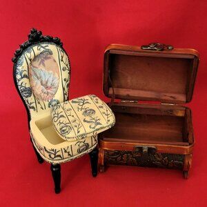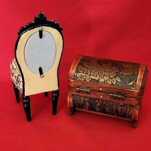 Enhance your space with these two elegant floral trinkets. The beautifully crafted small chair also has a slot for a mini photo and the small chest features intricate designs in classic black and cream tones, perfect for adding a touch of sophistication to your decor you can display these on a table, in a curio cabinet or even in a child's room.