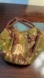 This hobo bag has patchwork design in earthy green and brown tones, a mix of satin and matte textures with a smooth dark brown handle.
