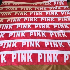 Soft blanket with bold PINK logo. Vibrant red and white design. Holiday edition collectors sherpa blanket. In excellent used condition. No stains or rips. Size: 60in by 72in.
