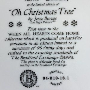 This collectors plate is the First issue in the 1993 " When All Hearts Come Home" Collection. The title is " Oh Christmas Tree " . This collection was issued by The Bradford Exchange, and the Artist is Jesse Barnes. Please Note: I have the Plate Only