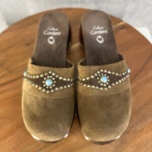 Colleen Cordero women’s clogs, size 6. Brown suede with turquoise stone accents and wood heel. Artisan boho aesthetic.
