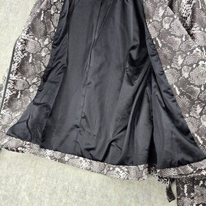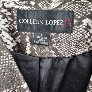 This chic Colleen Lopez moto jacket features a striking snake print design on faux leather, adding a bold and modern touch to your wardrobe. The asymmetrical front zipper and silver-tone hardware enhance its edgy aesthetic, while the belted sides provide customizable shaping. Fully lined with a luxurious fabric blend, the jacket ensures all-day comfort. Made with a polyurethane shell face and viscose backing, this piece is both fashionable and practical. Stylish detailing includes zippered cuffs and multiple zippered pockets for added flair and functionality. A versatile layering piece, this trendy jacket is crafted to make a statement. Exterior care instructions recommend cleaning with a damp cloth.