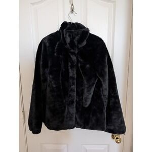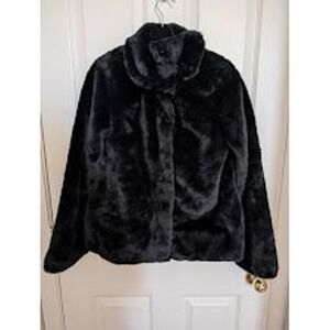 New without tags, no flaws noted, runs a bit oversized. Elegant faux fur jacket, a luxurious addition to any wardrobe. This stylish black jacket features a plush, soft faux fur exterior, offering both warmth and a sophisticated look. It has a face-framing collar and practical pockets, combining fashion with functionality. Perfect for an evening event, a chic daytime outing, or adding a touch of glamour to a casual ensemble