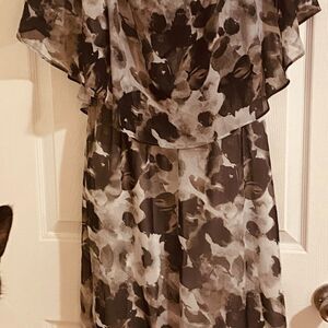 Sleeveless with flutter overlay; lined; ankle length; side slits. This chic flutter dress is an easy popover style. Style: Elasticized on or off shoulder design; pullover.