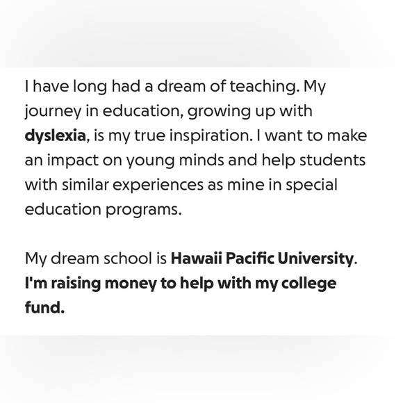 My friend is trying to raise money for her college fund and she asked me if I could spread the word or hopefully people even donate it would mean alot to her im trying to help her with her dream