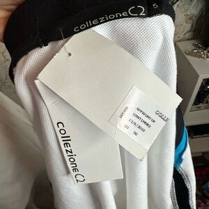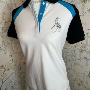 This Collezione C2 Women's Shirt is a size Small polo style shirt featuring an embroidered map of the Philippines in blue and white colors. Made of cotton material, it has short sleeves and a collared neckline, providing a basic and regular fit for everyday wear. The shirt is brand new with tags, making it a stylish and patriotic addition to any woman's wardrobe.