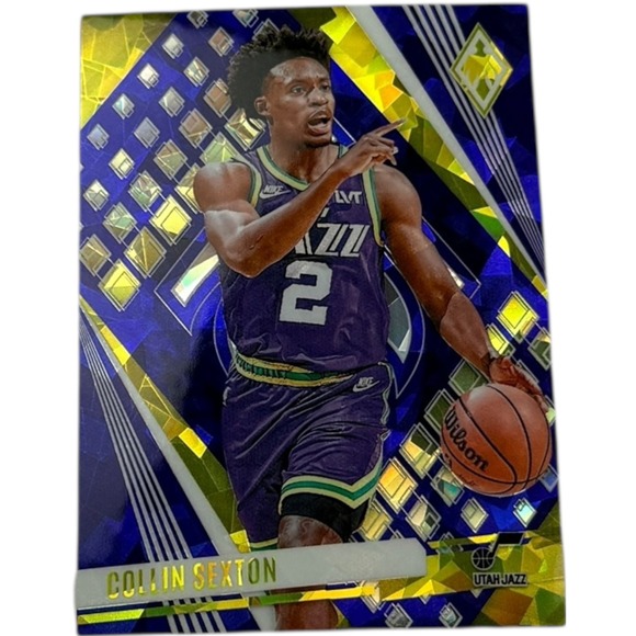 2023-24 Panini Phoenix Basketball card featuring Collin Sexton of the Utah Jazz. This card showcases Sexton in action, highlighting his skills as a guard. Ideal for collectors and fans of the Utah Jazz. Perfect for display or adding to a basketball card collection.