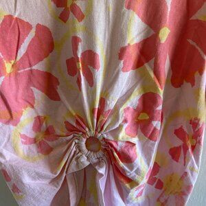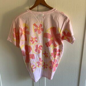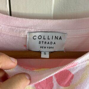 Collina Strada short-sleeve cotton top in "loopy pink" floral print with gathered ring at belly-button, creating a flirty cropped look. Size S. In used condition- no rips or stains; light pilling throughout.
