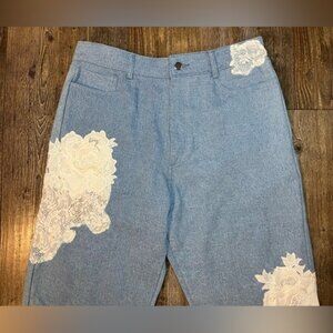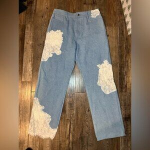 Collina Strada NWT Mikaela Beaded Lace Patched Straight Leg Jeans Medium/28. See size guide for their measurements. No flaws!!! 100% cotton. Baggy, designer, luxury jeans!!