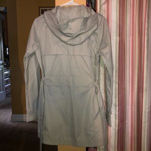 Beige Colombia rain jacket. Brand new but the tags fell off and were thrown away. The belt around the waist can be removed!