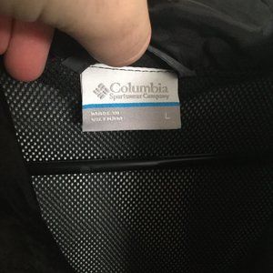 A lightweight Colombia jacket with zipper pockets, a net lining, velcrow flap over the zipper, bungee cord hood fastening system, and presumably water resistant if not proof.