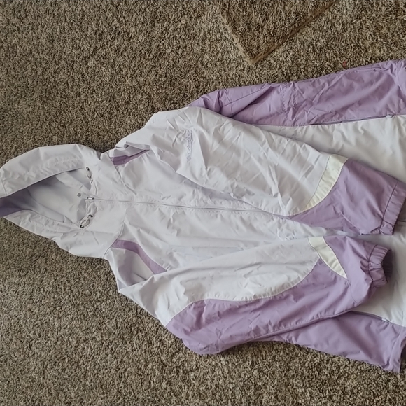 light weight - light purple/purple Colombian women's jacket size large. Has drawstrings on the hood and on the inside and along the bottom. It's like a windbreaker / light jacket for winter. Sorry for the wrinkles it's been in the back of my closet. Smoke free home.