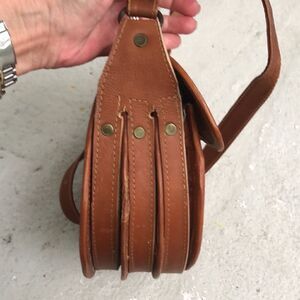 Beautiful three pocket Colombian bag has one zippered pocket in the front and one open pocket. The mark that I show on the back what are usually polish out. Measuring through the center of the bag is 9.25” x 8” with an adjustable strap. Cowhide fur on the front