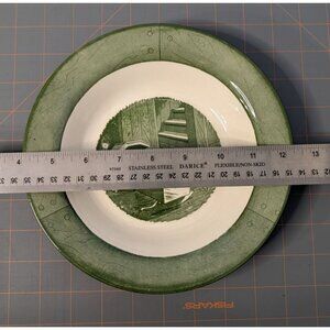 This bowl is the perfect addition to your dinnerware collection, unless you like your soup on the floor. Made in the USA with a charming green and white design, it's both a practical and stylish choice. Measuring 8 3/8 inches in diameter, it's the only rim soup bowl that might make your soup feel fancier than it is.