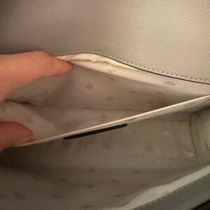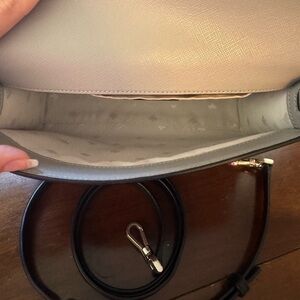 Small size bag with one exterior pocket and one interior pocket. Comes with a short chain strap and a long adjustable crossbody black strap. Used gently and in near perfect condition! Has black, grey, and white color blocking.
