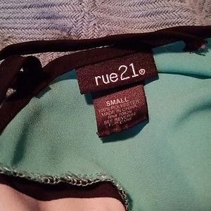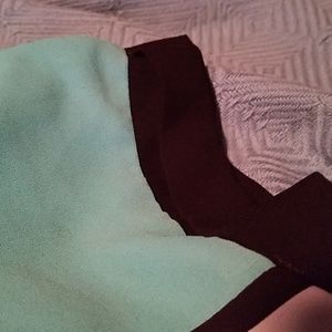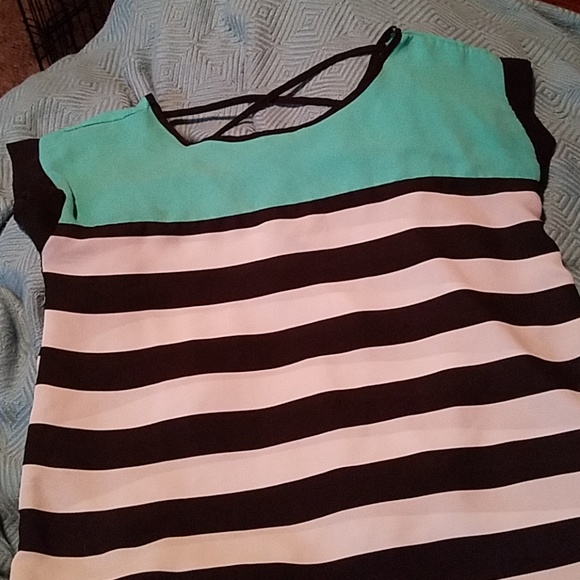 Light material blouse with teal color up top and black and white stripes. It has a cute strappy accent on the back and rolled sleeves.