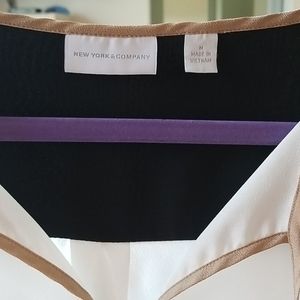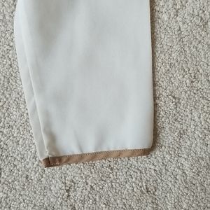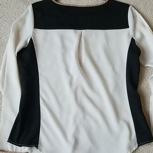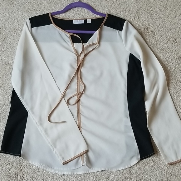 Hardly worn black and off white blouse in excellent used condition with tan colored tie neck and sleeve border.
