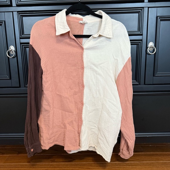 • brown, pink, cream • button down • true to size • fits slightly oversized