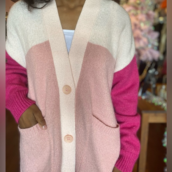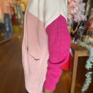 This Color Block Button-Up Cardigan is a cozy-chic essential for your wardrobe. Featuring a beautiful ombre effect transitioning from cream to pink with bold magenta sleeves, this cardigan is soft, stylish, and perfect for layering. It has convenient front pockets and a relaxed fit, making it a go-to for effortless everyday wear.