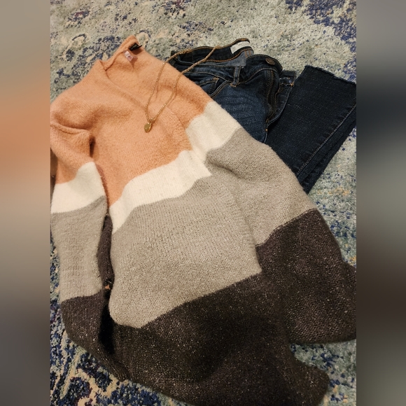 Veryyyy soft pink, white, and grey color block cardigan. It doesn't get any comfier than this sweater