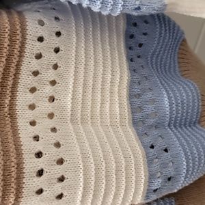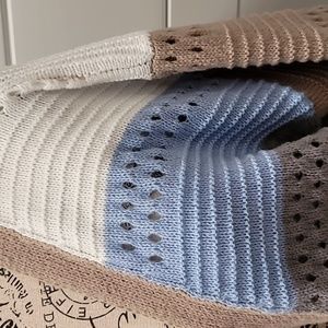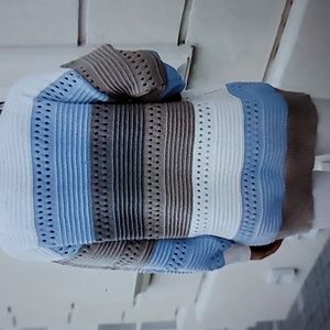 Long Sleeve, open front cardigan. Sleeves have a ribbed cuff. There is a pretty open weave pattern in some areas.