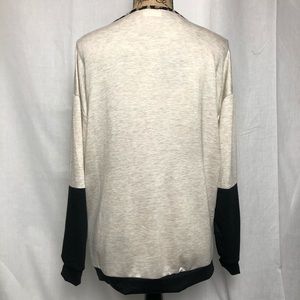 Comfy French terry cheetah print color block long sleeve. Soft to the touch. V-neck with criss cross detailing across the neck.