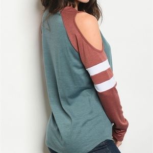 Blue and burnt sienna long sleeve cold shoulder tunic top. Super soft baby French terry. Content: 70% polyester 27% rayon 3% spandex. Made in the USA. Size small: Length: 27" Bust: 38" Waist: 38"