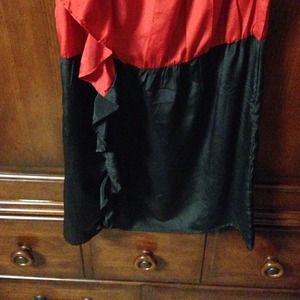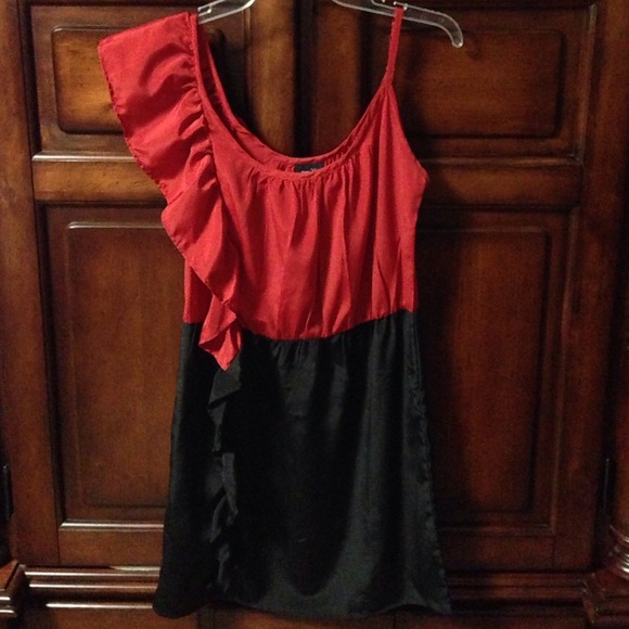 Red and black color block dress. Super cute with some drawn attention up through the dress to one shoulder with a ruffling detail!! Very flattering!!