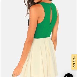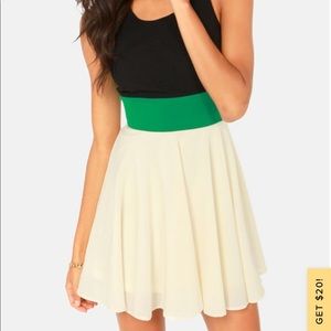 Glimpse into the future of fashion and you'll find that things are looking pretty adorable! The Block to the Future Black, Cream, and Green Dress combines a woven black bodice with a full skirt in cream, plus a bright green waistband and back to make a colorful and sweet skater dress. Back keyhole has top button closure. Hidden back zipper/hook clasp. Fully lined. 100% Polyester. Hand Wash Cold.