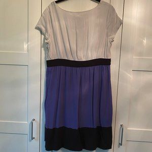 A line dress in a color block design with grey, black and indigo colors. Worn once for a bridal shower and then dry cleaned. Loft, size 10. Smoke free home.