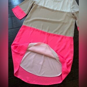 Neon Pink, tan and white color block mid length dress.