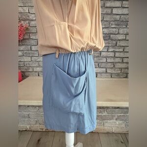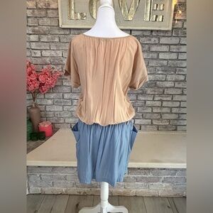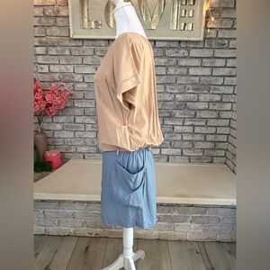 Super soft & slightly silky lightweight dress. The beige top features front pleating & the skirt (which has a lining) features two pockets. It also features two loops for a belt if you want to add this to the look. Pulls on over the head.