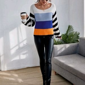 Color block drop shoulder sweater with striped sleeves & scoop neck