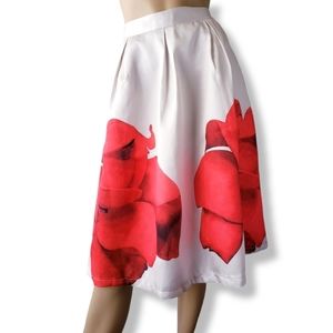 Colorblock (Off White & Red) skirt with a large floral print that extends front to side and back. Faille fabric (twill like with a sheen), structured, pleats, just below the knee, with metal zipper in the back. Non stretch.